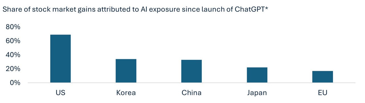 International markets show a similar, if less concentrated, pattern: roughly 25 per cent of the gains in Japan’s Topix 100, 35 per cent in Korea’s Kospi 100, 20 per cent in Europe’s STOXX 100 and one third in China’s CSI 300 have come from AI-linked stocks3. The concentration sits squarely in the compute value chain, including of course Nvidia, TSMC and SK Hynix.